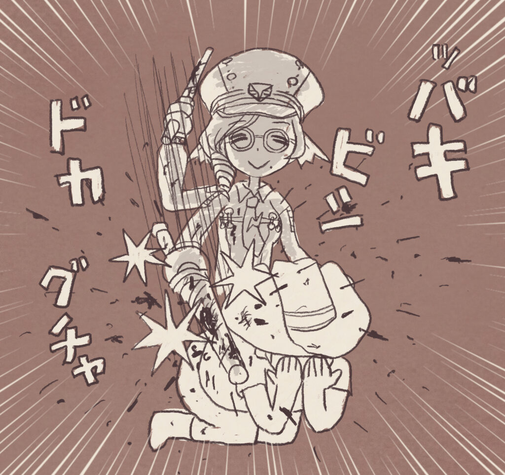 ツバキちゃんは、例の棒で殴る駅員さんドレア。