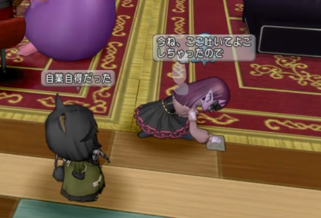 プクリポに染まったプレイヤーが、マスコットのように、あるいは小動物のように振る舞い、言葉遣いまで幼児退行していくのは、自然な帰結。